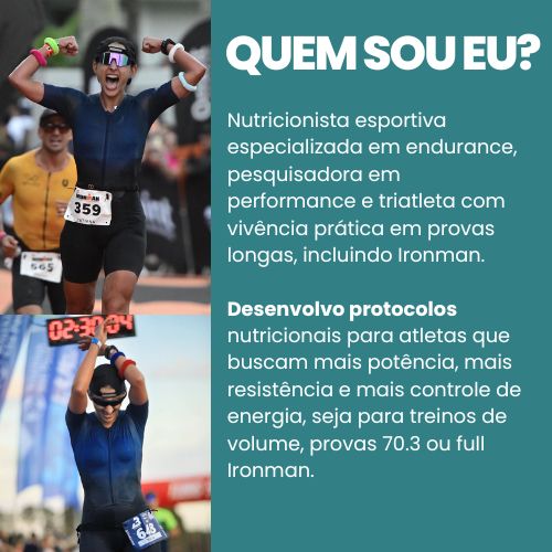 Sou nutricionista esportiva, triatleta e ex-competidora de Ironman. Há mais de uma década me dedico a estudar, aplicar e aprimorar estratégias nutricionais voltadas para alta performance, saúde e evolução consistente. Minha missão é ajudar atletas, praticantes de atividade física e pessoas comuns a alcançarem mais energia, resistência, foco e qualidade de vida por meio de protocolos construídos com ciência e experiência prática.